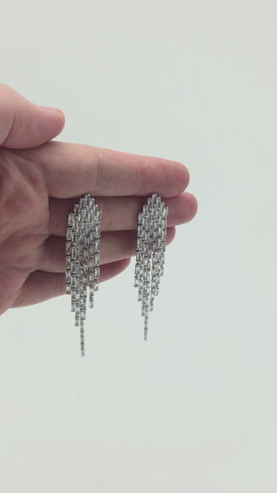 Confectionati din oțel inoxidabil argintiu de inalta calitate, acesti cercei sunt decorati cu siruri dense de cristale zirconiu transparente. Taietura precisa a pietrelor reflecta lumina intens, creand un efect vizual de "ploaie de diamante". Sunt alegerea suprema pentru mirese, petreceri de Revelion sau evenimente pe covorul rosu.