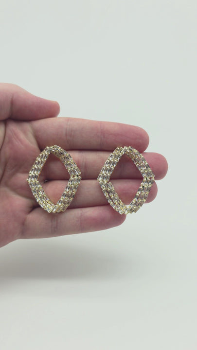 Confectionati din oțel inoxidabil cu finisaj auriu intens, acesti cercei se disting prin structura lor fixa si robusta. Cele trei siruri de cristale zirconiu sunt dispuse intr-un model intrepatruns, generand o stralucire solara spectaculoasa. Contrastul dintre metalul auriu si claritatea cristalelor ofera un aer regal, perfect pentru evenimente festive sau tinute de zi indraznete.