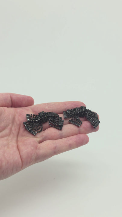 Descopera o piesa de inginerie bijutiera cu cerceii "Midnight Ribbon", un accesoriu care sfideaza rigiditatea metalului. Cu un design spectaculos in forma de funda supradimensionata, acesti cercei creeaza o iluzie optica fascinanta, imitand perfect caderea grea si fluida a unei tesaturi pretioase din catifea neagra.